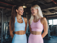 Обрати внимание на эластичные ткани, высокую посадку и мягкие швы. Хорошо, если топ можно носить отдельно — это делает комплект универсальным и уместным не только в зале, но и на прогулке.